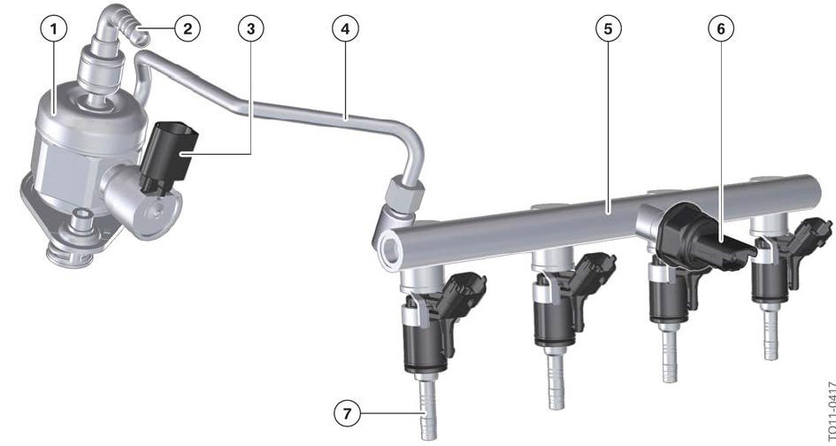 | 1 bomba de alta press�o 2 Conex�o, linha de baixa press�o 3 Conex�o, v�lvula de controle de quantidade 4 Linha de alta press�o , alta press�o bomba - 5 Rail 6 Rail sensor de press�o 7 Injetor da v�lvula solen�ide |