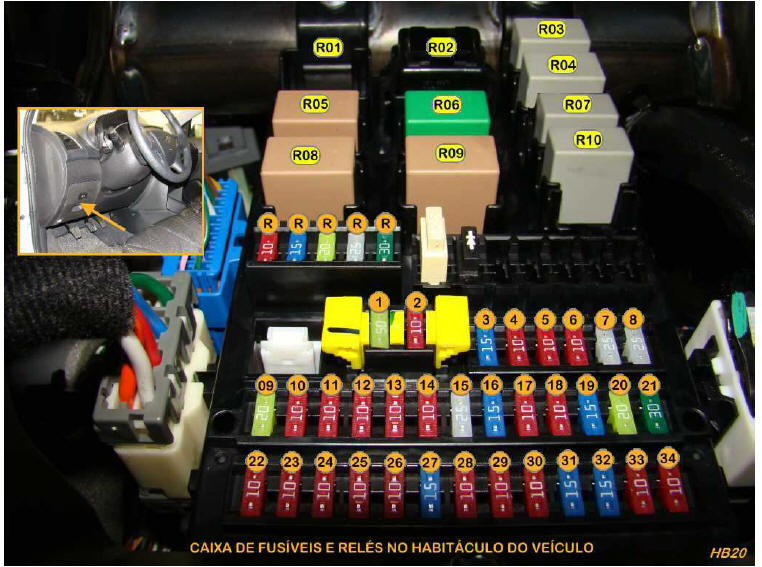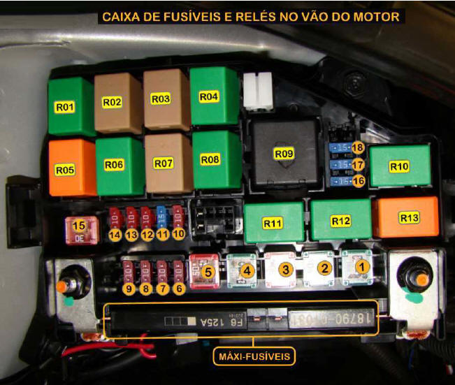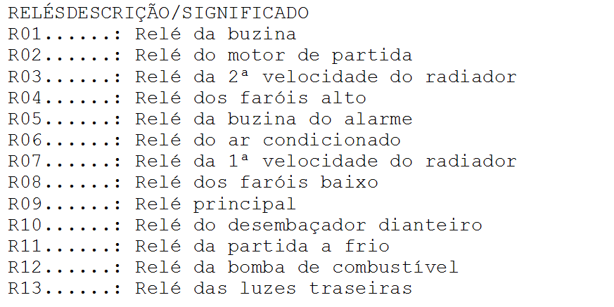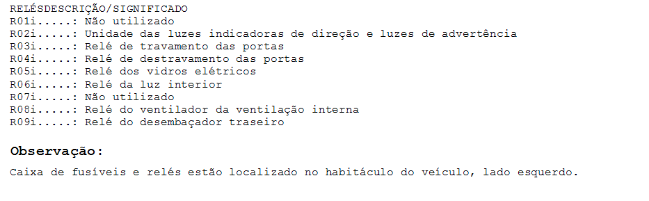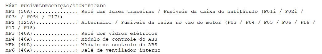 | FUS�VEL DESCRI��O/SIGNIFICADO F01i (20A)......: Sistema de �udio F02i (10A)......: Painel de instrumentos / Conector de diagn�stico / M�dulo de controle da carroceria (BCM) / Luz do compartimento de bagagem / M�dulo de controle do ar condicionado / Rel�gio digital / Luzes de leitura (sem parasol) / Sensor ultrass�nico de prote��o de intrus�o / Luz de teto / Luz de cortesia F03i (15A)......: Interruptor das luzes de freio F04i (10A)......: M�dulo do imobilizador / M�dulo MTS F05i (10A)......: Caixa de conectores fus�veis do painel de instrumentos (Rel� R06) F06i (25A)......: M�dulo de seguran�a dos vidros el�tricos do motorista F07i (25A)......: Interruptor principal dos vidros el�tricos F08i (25A)......: Interruptor principal dos vidros el�tricos / Interruptor do vidro el�trico do passageiro F09i (20A)......: Tomada de for�a F10i (10A)......: Sistema de �udio / Interruptor dos espelhos retrovisores externos / Rel�gio digital / M�dulo de controle da carroceria (BCM) F11i (10A)......: Far�is / Luz da placa de licen�a / Luzes combinadas traseiras (externa/interna) LE F12i (10A)......: Rel�gio digital / Conectores AUX e USB / Interruptor de advert�ncia / Sistema de �udio / Ilumina��o da alavanca Seletora da transmiss�o autom�tica / Painel de instrumentos / Ilumina��o do interruptor do ventilador / Interruptor principal dos vidros el�tricos / M�dulo de controle do ar condicionado / Interruptor de funcionamento incorreto / Luzes combinadas traseiras (interna-externa) LD / Far�is LD / Caixa de conectores fus�veis do compartimento do motor (Rel� 10) com acionamento autom�tico dos far�is F13i (10A)......: Interruptor de igni��o / Interruptor de travamento da igni��o / Interruptor da alavanca seletora (transmiss�o autom�tica) F14i (10A)......: Painel de instrumentos / M�dulo de controle da carroceria (BCM) / M�dulo de controle do ar condicionado / Lonzinador do painel / Caixa de conectores fus�veis do painel de instrumentos (Rel� R08 e Rel� R05) / Caixa de conectores fus�veis do compartimento do motor (Rel� R04 e Rel� R10) F15i (25A)......: Motor do limpador do para-brisa dianteiro / Interruptor multifun��o (limpador) F16i (15A)......: Motor do limpador do vidro traseiro / Interruptor multifun��o (lavador) F17i (10A)......: (Com acionamento autom�tico): Caixa de conectores fus�veis do compartimento do motor (Rel� R08) / (Sem acionamento autom�tico dos far�is): Far�is LE F18i (10A)......: Farois LD F19i (15A)......: Rel� das luzes de advert�ncia / Interruptor das luzes de advert�ncia F20i (20A)......: Caixa de conectores fus�veis do painel de instrumentos (Rel� R03 e Rel� R04) F21i (30A)......: Caixa de conectores fus�veis do painel de instrumentos (Rel� 09) F22i (10A)......: Painel de instrumentos / M�dulo de controle da carroceria (BCM) F23i (10A)......: Interruptor das luzes de advert�ncia F24i (10A)......: M�dulo de controle do ABS F25i (- -)......: N�o utilizado F26i (10A)......: M�dulo do imobilizador / M�dulo MTS / Interruptor das luzes de freio F27i (15A)......: M�dulo de controle do air-bag F28i (10A)......: Painel de instrumentos F29i (10A)......: Interruptor das luzes de r� F30i (10A)......: Sinal sonoro traseiro de assist�ncia de estacionamento / Sensor traseiro de assist�ncia de estacionamento LE/LD / Sensor traseiro de assist�ncia de estacionamento (central) LE-LD / M�dulo MTS / Alternador F31i (15A)......: Sensor de velocidade do ve�culo / Interruptor da alavanca seletora da transmiss�o / Gerador de pulsos "A/B" F33i