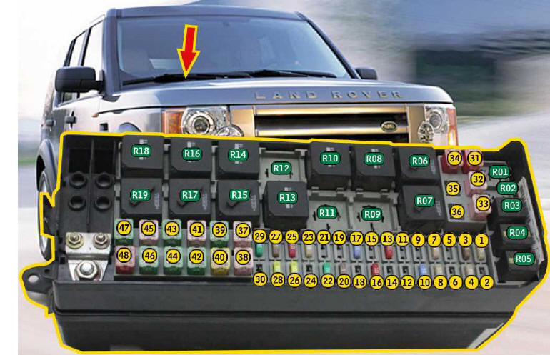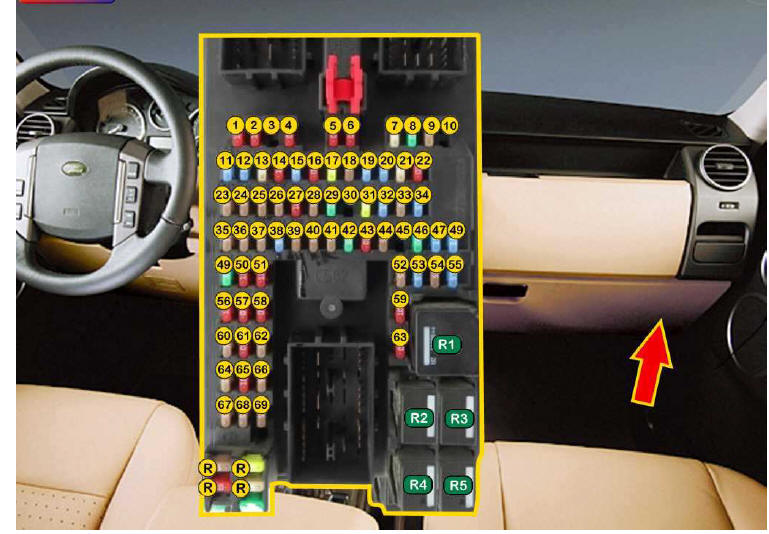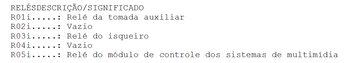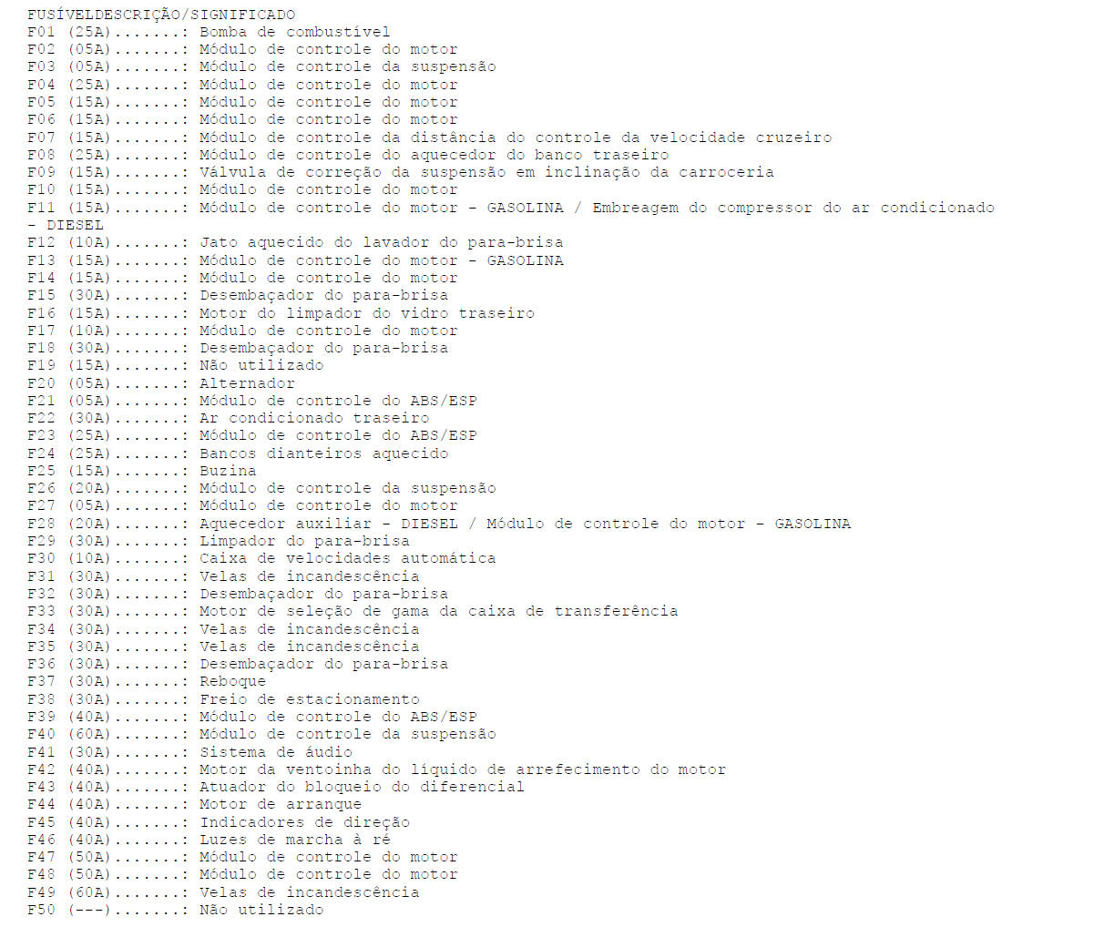 | FUS�VEL DESCRI��O/SIGNIFICADO F01i (05A)......: Sistema de �udio / Sistema de monitoriza��o da press�o dos pneus F02i (---)......: N�o utilizado F03i (15A)......: Luzes de nevoeiro dianteira F04i (05A)......: Espelho retrovisor interior anti-encandeamento / Regula��o autom�tica dos far�is F05i (05A)......: M�dulo de controle do ABS/ESP F06i (05A)......: Sensor de dist�ncia do controle da velocidade cruzeiro F07i (---)......: N�o utilizado F08i (---)......: N�o utilizado F09i (05A)......: Freio de estacionamento F10i (05A)......: M�dulo de controle da suspens�o F11i (10A)......: Luzes de marcha a r� do reboque F12i (05A)......: Luzes de marcha a r� F13i (---)......: N�o utilizado F14i (05A)......: Luzes de freio F15i (30A)......: Desemba�ador do vidro traseiro F16i (10A)......: Sistema do ar condicionado F17i (05A)......: Sistema de chave inteligente (entrada e arranque) / Sistema de trancagem central F18i (---)......: N�o utilizado F19i (05A)......: M�dulo de controle do motor F20i (10A)......: Aquecedor do volante F21i (10A)......: Sistema do ar condicionado / Unidades de regula��o dos far�is / Ilumina��o do interruptor F22i (05A)......: Caixa de velocidades autom�tica / Caixa de transferencia / Diferencial F23i (05A)......: Regula��o do farol F24i (10A)......: Luzes de presen�a da retaguarda direita F25i (10A)......: Luzes de presen�a da retaguarda esquerda F26i (---)......: N�o utilizado F27i (10A)......: Tomada do reboque F28i (---)......: N�o utilizado F29i (---)......: N�o utilizado F30i (25A)......: Vidro el�trico / Porta do passageiro / Sistema da trancagem central F31i (05A)......: Sensor de chuva / c�mara de vis�o traseira F32i (25A)......: Vidro el�trico do lado do motorista / Sistema de trancagem central / Espelhos retrovisores el�tricos F33i (---)......: N�o utilizado F34i (05A)......: Liberta��o da portinhola do dep�sito F35i (---)......: N�o utilizado F36i (05A)......: Sirene do sistema de alarme F37i (20A)......: Sistema de chave inteligente (entrada e arranque) / Sistema da trancagem central F38i (15A)......: Lavador do para-brisa F39i (25A)......: Vidro el�trico traseiro esquerdo / sistema de trancagem central F40i (05A)......: Sistema de trancagem central / Rel�gio / Regula��o do banco / Espelhos retrovisores el�trico / Vidro el�trico F41i (05A)......: Sistema de �udio F42i (30A)......: Banco do motorista F43i (15A)......: Bomba do lavador do vidro traseiro F44i (25A)......: Vidro el�trico traseiro direito / Sistema da trancagem central F45i (30A)......: Banco do passageiro F46i (---)......: N�o utilizado F47i (20A)......: Teto de abrir F48i (30A)......: Tomada do reboque F49i (05A)......: Regula��o do farol direito F50i (05A)......: Regula��o do farol esquerdo F51i (05A)......: Interruptores do volante F52i (---)......: N�o utilizado F53i (20A)......: Isqueiro F54i (15A)......: Tomada do reboque F55i (20A)......: Tomadas auxiliares