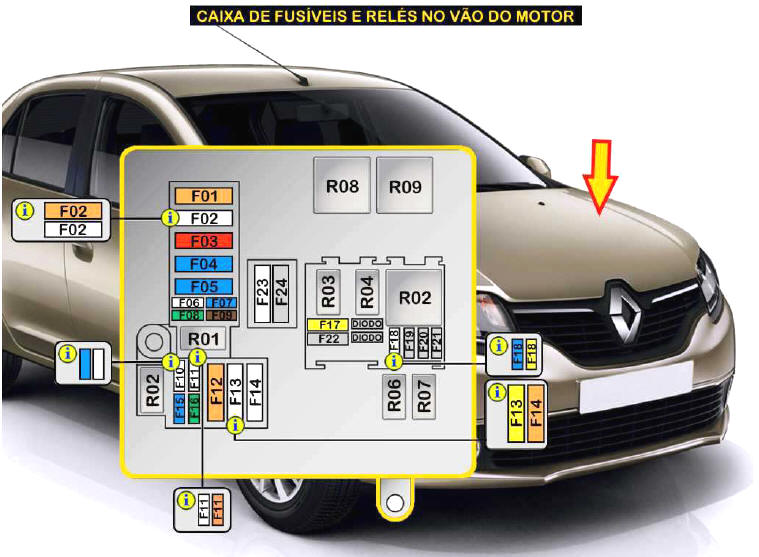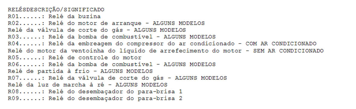 | FUS�VELDESCRI��O/SIGNIFICADO F01 (40A).......: Desemba�ador do para-brisa F02 (40A/80A)...: Desemba�ador do para-brisa / Aquecedor auxiliar F03 (50A).......: M�dulo de controle do ABS/ESP F04 (60A).......: Sistema de alarme / Caixa de fus�veis e rel�s no habit�culo - Fus�veis F02i / F27i / F35i / F41i ao F44i F05 (60A).......: Caixa de fus�veis e rel�s no habit�culo - Fus�veis F20i / F24i / F36i ao F40i / F47i F06 (25A).......: M�dulo de controle do ABS/ESP F07 (15A).......: Luzes de nevoeiro / M�dulo de controle de fun��es m�ltiplas F08 (30A).......: Desemba�ador do vidro traseiro / Caixa de fus�veis e rel�s no habit�culo - Fus�vel F48i F09 (7,5A)......: M�dulo de controle de fun��es m�ltiplas / Sistema de telefone / Sensor do estado da bateria F10 (15A).......: Compressor do ar condicionado - COM AR CONDICIONADO Motor da ventoinha do l�quido de arrefecimento do motor - SEM AR CONDICIONADO F11 (25A).......: Caixa de fus�veis e rel�s no v�o do motor / Bomba de combust�vel no dep�sito / M�dulo de controle do motor / Sistema do ar condicionado / Motor da ventoinha do l�quido de arrefecimento F12 (40A).......: Motor da ventoinha do l�quido de arrefecimento do motor F13 (20A/70A)...: Sistema de g�s - ALGUNS MODELOS / M�dulo de controle da caixa de velocidades - ALGUNS MODELOS F14 (80A).......: Dire��o assistida F15 (15A).......: M�dulo de controle da caixa de velocidades F16 (30A).......: Motor de arranque F17 (20A).......: Bomba de combust�vel / Sensor do indicador de combust�vel no dep�sito F18 (15A/20A)...: M�dulo de controle do motor / Sistema do ar condicionado / Motor da ventoinha do l�quido de arrefecimento / Motor de arranque F19 (---).......: N�o utilizado F20 (---).......: N�o utilizado F21 (---).......: N�o utilizado F22 (---).......: N�o utilizado F23 (80A).......: M�dulo de controle da caixa de velocidades F24 (---).......: N�o utilizado DIODO...........: Diodo da embreagem do compressor do ar condicionado DIODO...........: Diodo do motor da ventoinha do l�quido de arrefecimento do motor