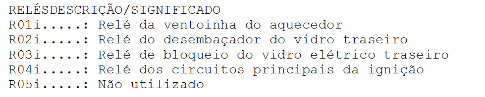| FUS�VEL DESCRI��O/SIGNIFICADO F01i (15A)......: Sistema de g�s F02i (25A)......: Vidros el�tricos F03i (---)......: N�o utilizado F04i (---)......: N�o utilizado F05i (---)......: N�o utilizado F06i (---)......: N�o utilizado F07i (---)......: N�o utilizado F08i (---)......: N�o utilizado F09i (---)......: N�o utilizado F10i (---)......: N�o utilizado F11i (30A)......: Vidros el�tricos F12i (10A)......: Luz do farol alto esquerda / M�dulo de controle de fun��es m�ltiplas F13i (10A)......: Luz do farol alto direita F14i (10A)......: Luz do farol baixo esquerda / M�dulo de controle de fun��es m�ltiplas F15i (10A)......: Luz do farol baixo direita F16i (05A)......: Luzes de presen�a e da retaguarda / Sistema de controle da velocidade cruzeiro / Luzes da placa / Sistema de trancagem central / Interruptor das luzes intermitentes de perigo / Sistema auxiliar de estacionamento / M�dulo do r�dio / Painel de comando do aquecedor ou ar condicionado / M�dulo de controle de fun��es m�ltiplas F17i (05A)......: Luzes de presen�a e da retaguarda / Sistema de controle da velocidade cruzeiro / Luzes da placa / Sistema de trancagem central / Interruptor das luzes intermitentes de perigo / Sistema auxiliar de estacionamento / Luzes do habit�culo / M�dulo do r�dio / Painel de comando do aquecedor ou ar condicionado / M�dulo de controle de fun��es m�ltiplas F18i (05A/30A)..: Caixa de velocidades manual com comando autom�tico / Caixa de velocidade autom�tica / Motor de arranque / M�dulo de controle de fun��es m�ltiplas F19i (30A)......: Interruptor do lavador e limpador do para-brisa / Motor do limpador do para-brisa / M�dulo de controle de fun��es m�ltiplas F20i (40A)......: Painel de comandos do aquecedor ou ar condicionado F21i (30A)......: Vidros el�tricos F22i (7,5A).....: M�dulo de controle de fun��es m�ltiplas / Luzes traseiras F23i (15A)......: Buzina F24i (20A)......: Sistema de trancagem central F25i (05A)......: M�dulo de controle do ABS/ESP / Imobilizador / Sensor de posi��o da dire��o / Interruptor da posi��o do pedal da embreagem / Luzes de freio F26i (10A)......: Luzes do habit�culo / Circuitos principais da igni��o / Painel de comando do aquecedor ou ar condicionado F27i (05A)......: Aquecedor auxiliar / Sistema de controle da velocidade cruzeiro / Aviso de cinto de seguran�a colocado / M�dulo do sistema auxiliar de estacionamento / Desemba�ador do vidro traseiro / Desemba�ador do para-brisa F28i (15A)......: Interruptor do lavador e limpador do para-brisa / Sistema do lavador e limpador do para-brisa e vidro traseiro / Motor do limpador e lavador do vidro traseiro / Luzes de marcha � r� / Luzes traseiras / M�dulo de controle do sistema auxiliar de estacionamento F29i (05A/15A)..: M�dulo do r�dio / M�dulo de controle do sistema auxiliar de estacionamento / Aviso do cinto de seguran�a colocado / Sistema de controle da velocidade cruzeiro / Desemba�ador do vidro traseiro / Bancos aquecidos /Telefone F30i (7,5A).....: Interruptor combinado / Far�is F31i (7,5A).....: Luzes traseiras / Luz de freio central / M�dulo de controle de fun��es m�ltiplas F32i (05A)......: M�dulo de controle do motor / Painel de instrumentos / M�dulo de controle de fun��es m�ltiplas / Bomba de combust�vel/ Interruptor de sele��o da velocidade da caixa de velocidades F33i (05A)......: M�dulo de controle do air-bag F34i (7,5A).....: M�dulo de controle da caixa de velocidades / Luzes traseiras / M�dulo de controle do sistema auxiliar de estacionamento / Luzes de marcha � r� / M�dulo de controle de fun��es m�ltiplas F35i (05A)......: Dire��o assistida F36i (20A)......: M�dulo de controle do reboque F37i (15A)......: M�dulo de controle de fun��es m�ltiplas / Caixa de fus�veis e rel�s do habit�culo - fus�veis F26i / F27i / F49i F38i (05A)......: M�dulo de controle de fun��es m�ltiplas F39i (15A)......: Luzes traseiras / Espelhos retrovisores das portas / Indicadores de dire��o laterais / Interruptor principal do sistema de trancagem central / Interruptor das luzes intermitentes de perigo / Far�is F40i (20A)......: Interruptor combinado / Caixa de fus�veis e rel�s do habit�culo - fus�veis F14i / F15i / F22i F41i (15A)......: Buzina F42i (25A)......: Interruptor combinado / Caixa de fus�veis e rel�s do v�o do motor / Caixa de fus�veis e rel�s do habit�culo - fus�veis F12i / F13i / F16i / F17i / F23i F43i (---)......: N�o utilizado F44i (05A)......: Painel de instrumentos F45i (7,5A).....: M�dulo do r�dio / M�dulo de controle de fun��es m�ltiplas / Motor da ventoinha do aquecedor ou ar condicionado / Painel de comandos do aquecedor ou ar condicionado F46i (15A)......: Isqueiro F47i (15A)......: Conector de diagn�stico / M�dulo do r�dio F48i (05A)......: Espelhos retrovisores das portas F49i (05A)......: Espelhos retrovisores das portas