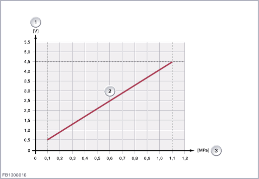 As informações que indicam a pressão do combustível seguem para o módulo do sistema eletrônico do motor digital DME através de um fio de sinal. O sinal de pressão de combustível para avaliação flutua dependendo da pressão. O alcance de medição de aprox. 0,5 - 4,5 volts corresponde a uma pressão de combustível de 0,1 MPa (1 bar) a 1,1 MPa (11 bar).