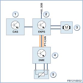 Bomba de combustível elétricaA bomba de combustível elétrica é uma unidade no tanque; sua função é fornecer combustível para o motor. No sistema de "controle eletrônico da bomba de combustível", a bomba eletrônica de combustível é ativada de acordo com os requisitos. O DME emprega a demanda do motorista e condições operacionais instantâneas do motor para calcular a quantidade de combustível necessária em qualquer junção específica. A quantidade de combustível necessária é transmitida ao módulo eletrônico de controle da bomba de combustível EKPS na forma de uma mensagem no barramento CAN. O módulo eletrônico de controle da bomba de combustível EKPS traduz essa mensagem em uma tensão de saída PWM. Este processo é suportado por curvas características para a necessidade de combustível armazenadas no módulo de controle da bomba de combustível (EKPS). As curvas características são codificadas para o motor e modelo específicos. O módulo eletrônico de controle da bomba de combustível EKPS usa uma tensão de saída modulada por largura de pulso (sinal PWM) para regular a velocidade da bomba de combustível elétrica, garantindo assim que a bomba de combustível forneça precisamente a quantidade de combustível necessária. A bomba de combustível elétrica fornece combustível do tanque para a bomba de alta pressão através da linha de fornecimento a uma pressão de aproximadamente 5 bar. Esta pressão primária é monitorada pelo sensor de pressão de combustível. A taxa de entrega da bomba de combustível elétrica é controlada pela demanda.