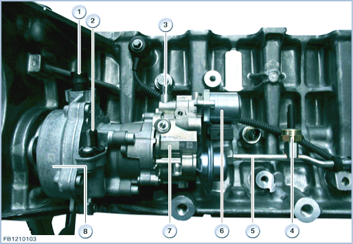 Sistema de combustível de baixa pressãoO motor a gasolina funciona com injeção direta de combustível. A injeção direta de combustível aumenta o desempenho. A pressão máxima de combustível é de 200 bar (marcha lenta: 50 bar, carga total WOT: 200 bar). O uso de injeção direta de combustível cria uma preparação de mistura homogênea em toda a câmara de combustão. A preparação homogênea da mistura significa que a razão combustível-ar é regulada estequiometricamente da mesma maneira que na injeção de combustível na tubulação de entrada (Lambda = 1). Uma mistura estequiométrica de ar-combustível contém uma proporção de 14,7 kg de ar para 1 kg de combustível. A formação de mistura homogênea torna possível usar um sistema convencional de controle de emissões. A injeção multiponto totalmente seqüencial com controle seletivo para cada cilindro individual oferece as seguintes vantagens: