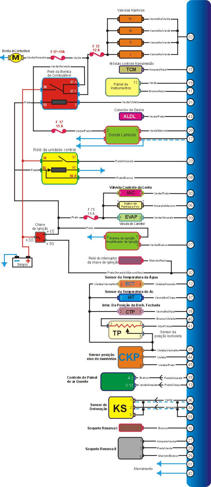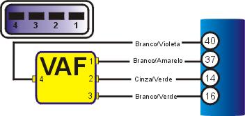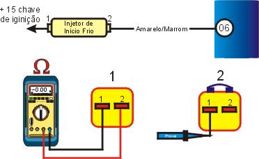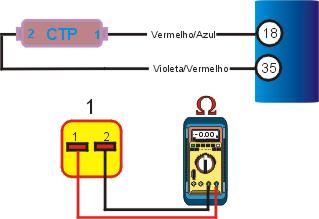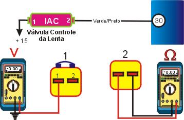 1 �Igni��o desligada, desconecte o multi-plug da unidade central, cheque a resist�ncia dos terminais com o MUTLITESTE DIGITAL, se a resist�ncia n�o for a especificada pela tabela abaixo, cheque os cabos. |