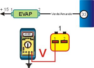 1 � Igni��o desligada, desconectar o multi-plug da v�lvula (EVAP), Igni��o ligada motor parado cheque a voltagem dos terminais e terra do multi-plug da v�lvula de canister com o MULTITESTE DIGITAL confira voltagem com a tabela, se a voltagem n�o for a mesma especificada cheque cabos e fus�veis. |