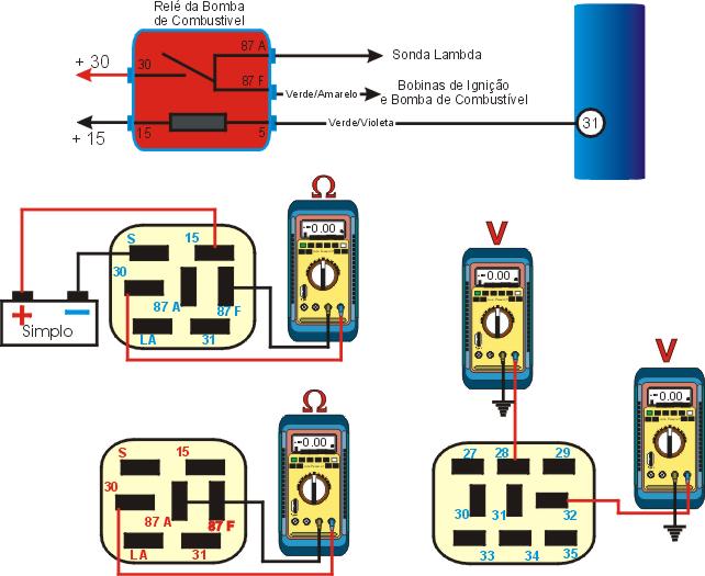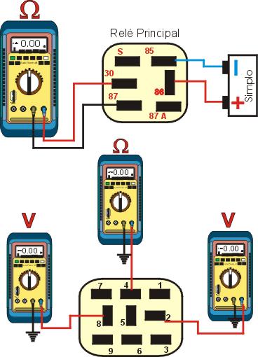 1 � Igni��o ligada, deve ser ouvido o rel� funcionando se n�o ouvir o rel�, igni��o desligada, remova o rel� cheque a resist�ncia nos terminais do rel� e terra como MUTLITESTE DIGITAL, ligue a igni��o, cheque os terminais do rel� e terra, se a resist�ncia n�o conferir com as da tabela, confira os cabos. |
