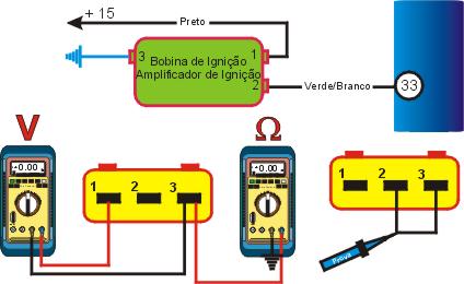 1- Igni��o desligada, desconecte o multi-plug do m�dulo de pot�ncia, cheque a resist�ncia dos terminais do multi-plug e terra com o MULTITESTE DIGITAL, se a resist�ncia n�o for a mesma especificada pela tabela abaixo verifique os cabos . |