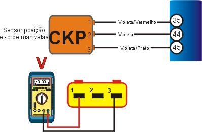 1 � Igni��o desligada, desconecte o multi-plug do sensor da posi��o da �rvore de manivelas, ligue a igni��o, cheque a Voltagem dos terminais do multi-plug com o MULTITESTE DIGITAL, deve conferir com a Voltagem especificada na tabela abaixo . |