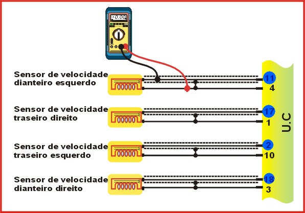 | Multiteste no modo Ohmimetro ligado ao Sensor de Velocidade checar a Resistência que devera ser de 1 a 1,3 KW. Fazer teste individual. |