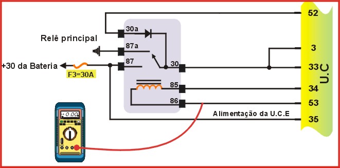 | Com um Multiteste no modo voltimetro no pino 30 do Relê deve ser positivo 12V da Bateria. |
