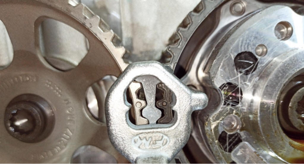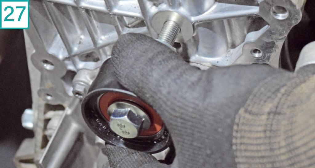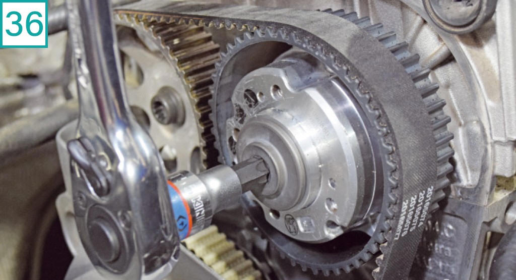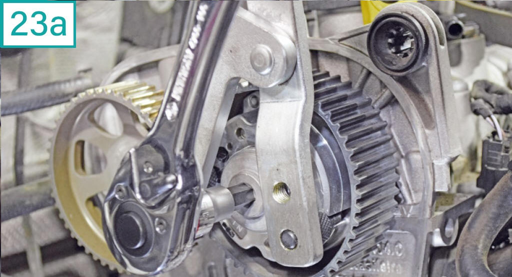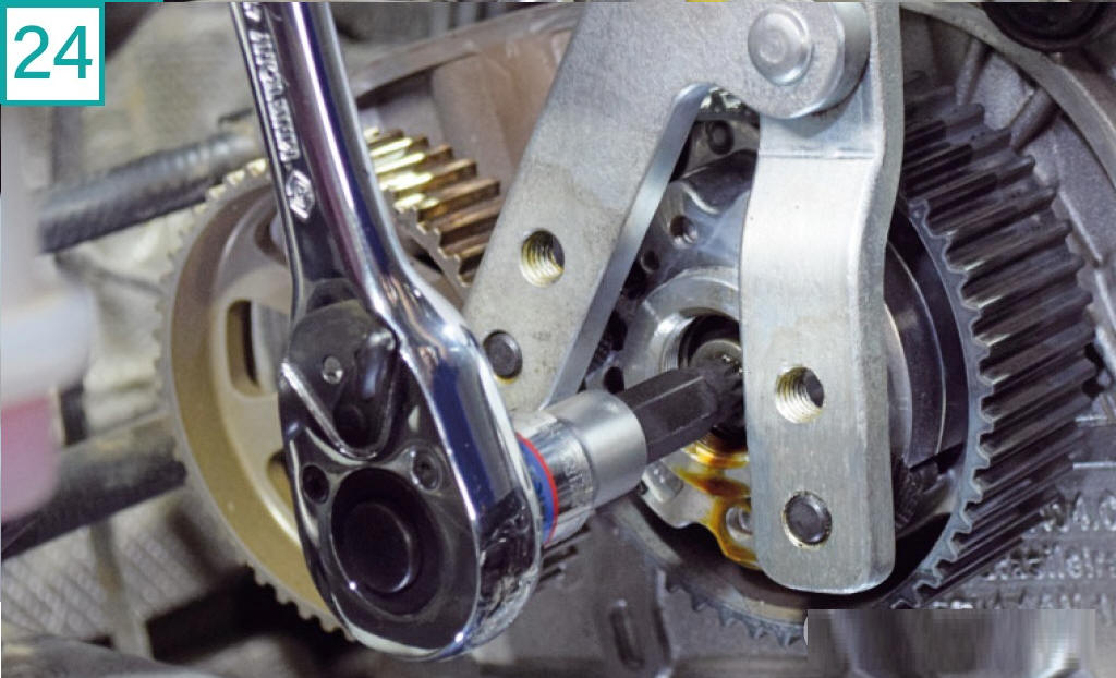 24) Solte as polias de admiss�o e escape com soquete multiestriado M12. No momento da soltura, trave cada polia com a ferramenta adequada (na foto: Raven 121011). Nunca utilize somente a ferramenta de fasagem para segurar os comandos ao soltar ou apertar os parafusos das polias. Importante: Como � necess�rio soltar as polias para coloc�-las no ponto correto na instala��o, torna-se obrigat�rio trocar os parafusos, uma vez que s�o el�sticos e sofrem alto torque com etapa angular no aperto.