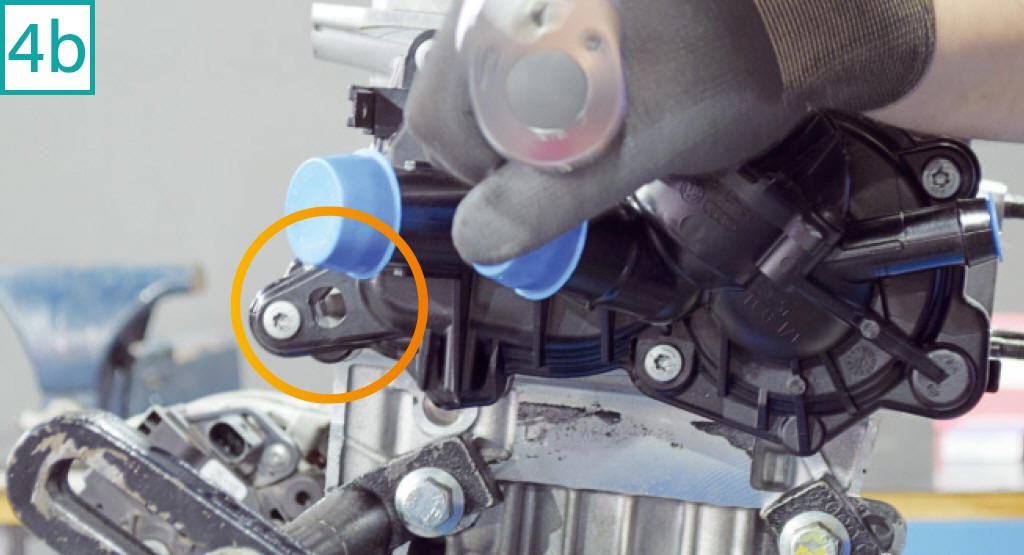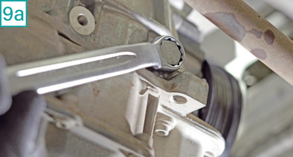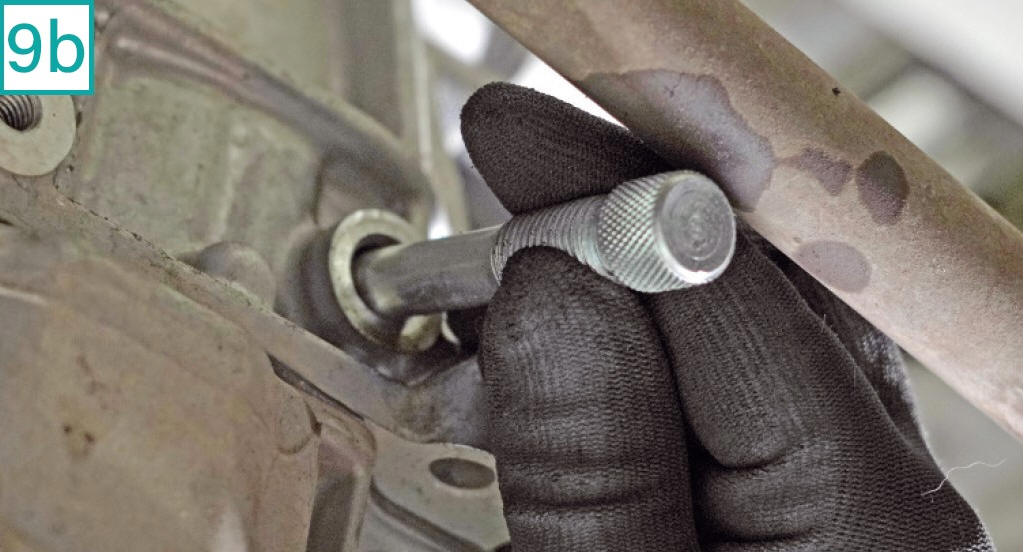 9) Utilize uma ferramenta especial (equivalente a Raven c�digo 111113) para travar o virabrequim. Solte o buj�o lateral com chave 18 mm (9a) e a instale (9b). Gire o motor no sentido hor�rio at� o virabrequim encostar na ferramenta. Em alguns modelos, pode n�o haver espa�o suficiente para a instala��o do buj�o por causa da interfer�ncia do semieixo; neste caso, o buj�o deve ser acessado com o ve�culo ainda no ch�o. No Polo MPI, n�o houve esse problema. (9c). Importante: Este passo n�o significa que o 1� cilindro esteja em PMS (ponto morto superior). Ele tamb�m pode estar em PMI (ponto morto inferior). Para ter certeza, verifique no cabe�ote se os encaixes da ferramenta especial de travamento dos comandos est�o na horizontal, o que atesta o PMS. Caso fiquem na diagonal, significa o 1� cilindro est� em PMI, ou seja, � necess�rio remover a ferramenta do virabrequim, dar mais uma volta no motor e colocar a ferramenta de volta.