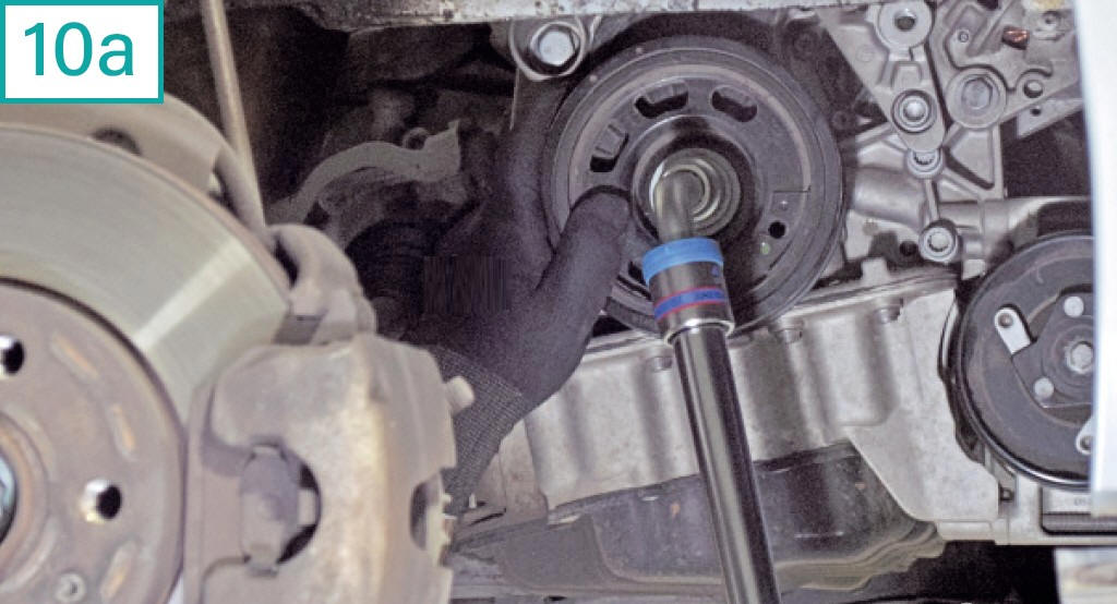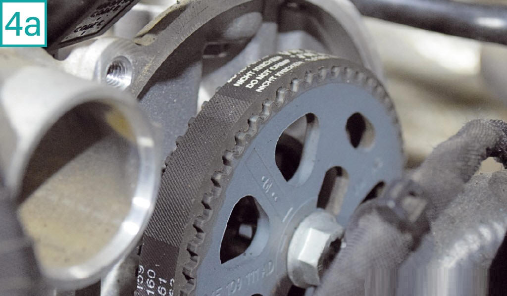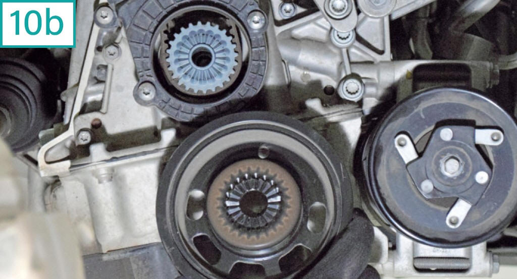 10) Com o virabrequim travado, remova a polia de acess�rios com soquete estriado 21 mm (10a). Apesar de seu encaixe com a polia de sincronismo ter um estriado semelhante a pequenos gomos (10b), a polia de acess�rios n�o � chavetada, mas possui refer�ncia da posi��o na capa pl�stica da correia de sincronismo. Lembre-se que a montagem correta de todas as polias � important�ssima, entre outros motivos, devido aos diferentes balanceamentos de peso de cada pe�a para compensar a vibra��o do n�mero �mpar de cilindros. 11) Solte os cinco parafusos da capa pl�stica inferior da correia de sincronismo com soquete hexalobular T30.