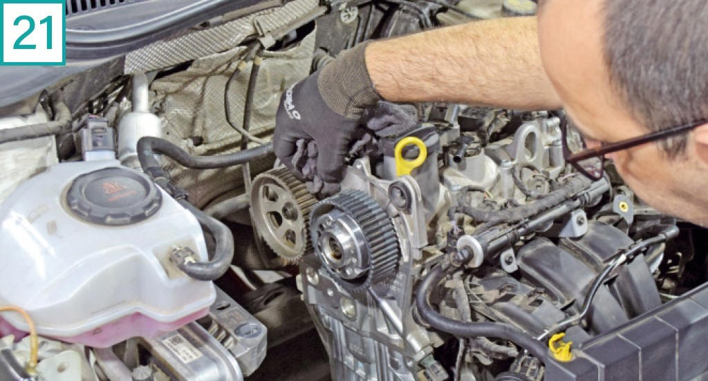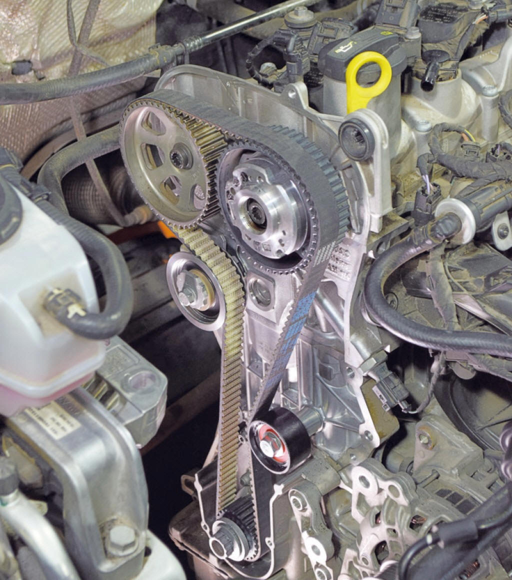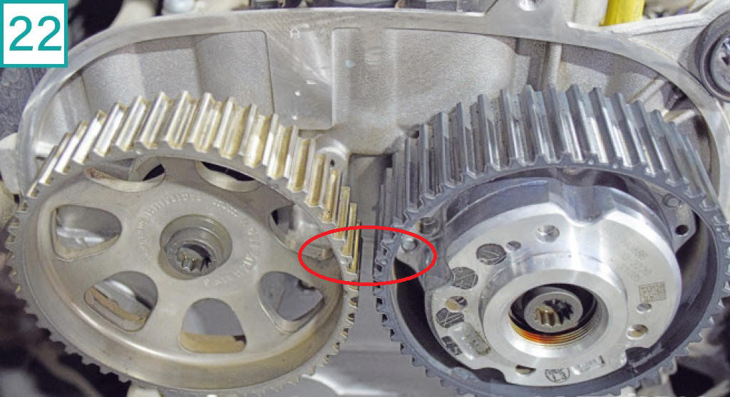 22) Para colocar o motor EA211 no ponto correto a cada troca de correia, � obrigat�rio soltar as polias de comando, tanto de admiss�o quanto escape. As polias s�o triovais para que, em funcionamento, a polia estabilize a correia, esticando-a na hora da abertura das v�lvulas. O posicionamento correto de trabalho das polias tamb�m respeita o correto balanceamento de peso para compensar o n�mero �mpar de cilindros e evitar vibra��es. �Por isso, n�o adianta nada fasar o virabrequim e os comandos, mas n�o soltar as polias para coloc�-las no ponto�