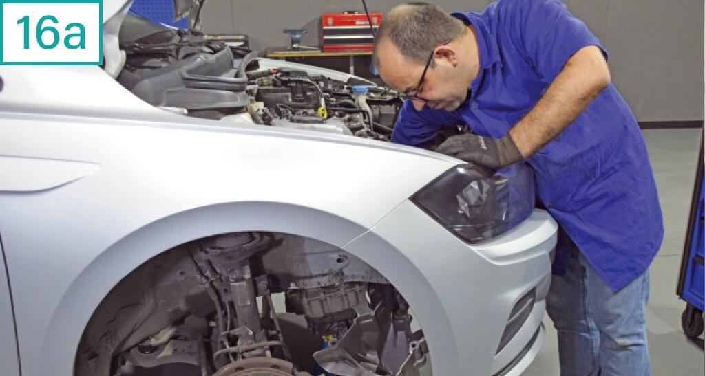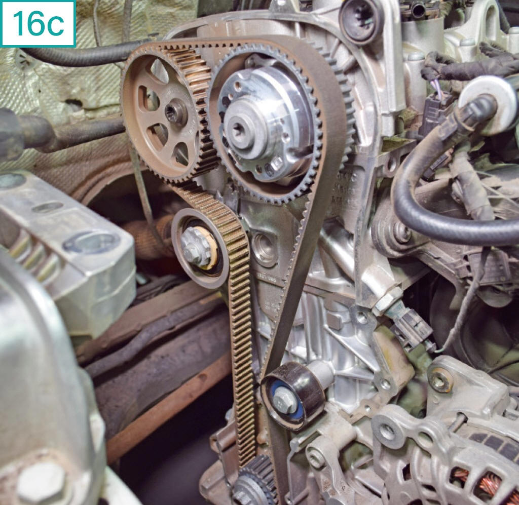 Importante: � poss�vel fazer o procedimento sem a remo��o do suporte. Por�m, como se trata de uma correia de sincronismo menos flex�vel que a convencional (16b), ao ser manipulada para passar por tr�s do suporte, ela pode vincar e sofrer o rompimento dos cordon�is de sua estrutura, o que inutiliza a pe�a. Se for colocada em uso mesmo assim, vai quebrar e causar danos extensos ao motor. �Os cordon�is s�o feitos de fibra de vidro. Por esse motivo, a correia aguenta tra��o, s� que n�o pode ser dobrada�, explica Nelson. Outro problema no procedimento sem remo��o da tampa � a necessidade de usar um torqu�metro especial para aplicar o torque do tensor e do rolamento-guia. Aqui, a demonstra��o segue o procedimento mais adequado e seguro (16c). |