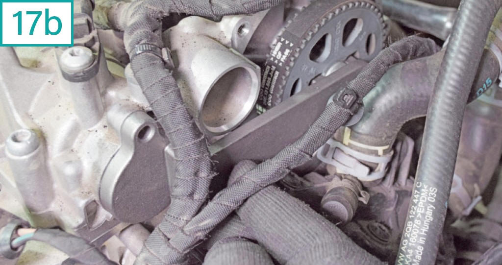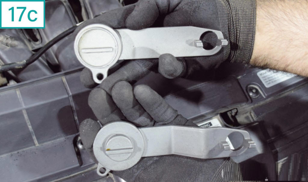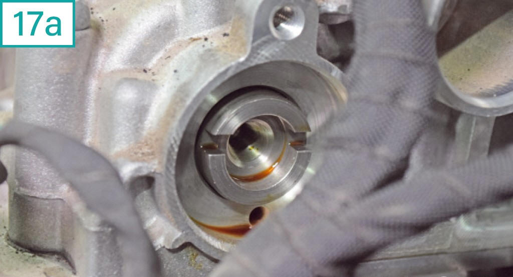17) Para inserir a ferramenta de fasagem dos eixos comandos de v�lvulas (equivalente a Raven c�digo 111112), observe o encaixe exc�ntrico na extremidade do comando de admiss�o. O semic�rculo menor sempre deve estar voltado para cima (17a). Veja tamb�m os orif�cios pr�ximos ao centro da polia da bomba d��gua (comando de exaust�o). Na instala��o, tome cuidado com tubula��es e chicotes na �rea, que podem ficar bem justos com a ferramenta (17b). |