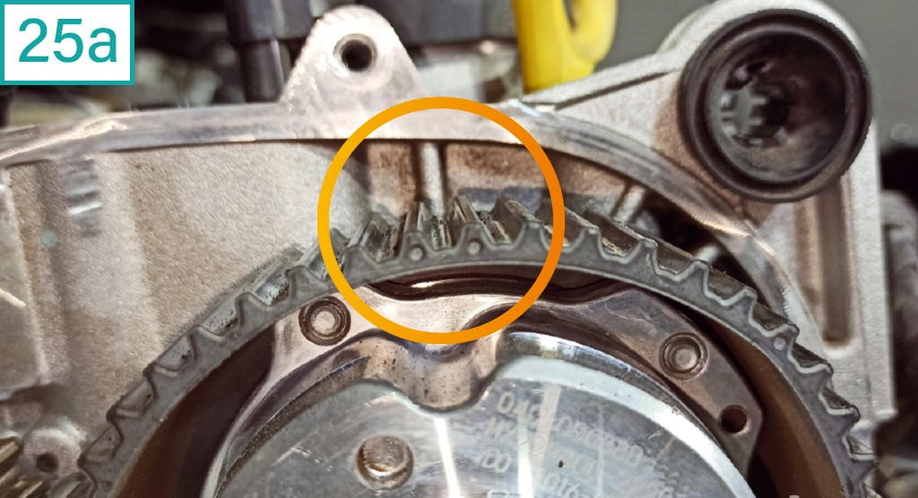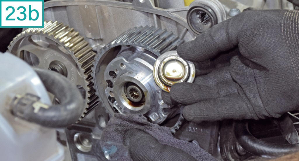 ![]() 23) A polia da admiss�o possui um tamp�o, que deve ser removido com soquete hexalobular T55 (23a). Como o sistema variador de fase trabalha com c�maras de �leo dentro da polia, pode vazar lubrificante pela regi�o. Observe e limpe (23b) |