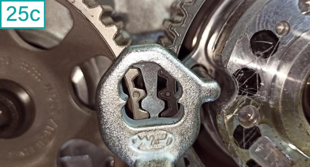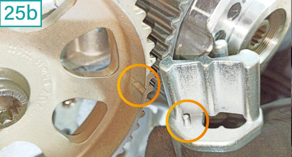 25) Para obter o ponto correto das polias dos eixos comandos, observe alguns pontos de refer�ncia. O primeiro � o ressalto na tampa dos comandos de v�lvulas, que possui um ressalto vertical que deve coincidir entre dois pontos da polia de admiss�o (25a). H� um terceiro ponto � esquerda, que deve coincidir com outro ponto na polia de exaust�o. Uma ferramenta especial (equivalente a Raven c�digo 111114) � respons�vel pela marca��o correta. Observe que ela possui um pino que deve se encaixar em um ressalto na polia de exaust�o (25b e 25c).