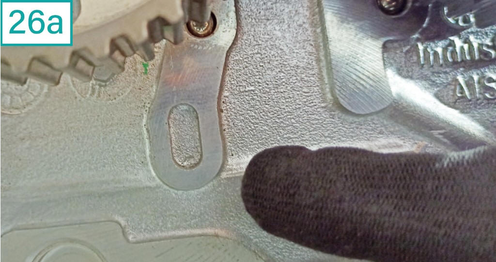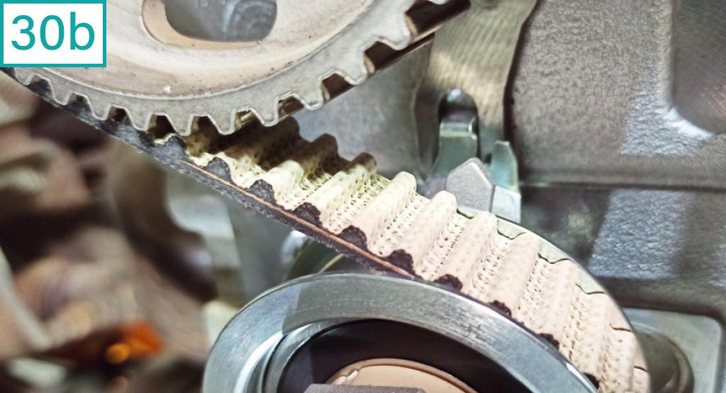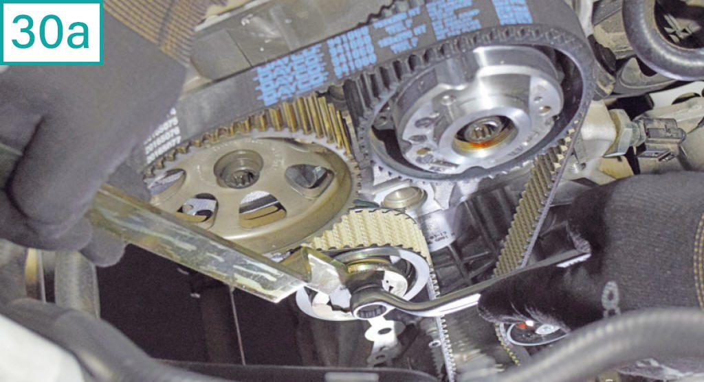 30) Com uma chave especial (equivalente a Raven c�digo 111116), gire a chapa reguladora de tens�o do tensor no sentido hor�rio (30a), at� o ponteiro atingir a marca do tensionamento ideal: uma fenda pr�xima a seu encaixe no bloco (30b). Ainda n�o aplique o torque de fixa��o do tensor. Os pontos das polias v�o se desencontrar um pouco, o que � normal.