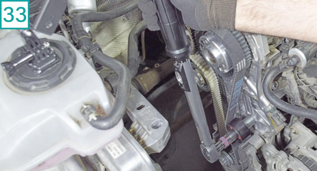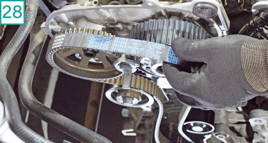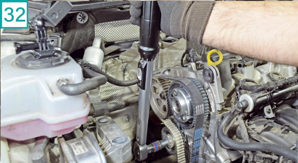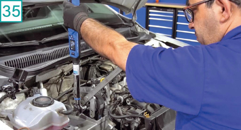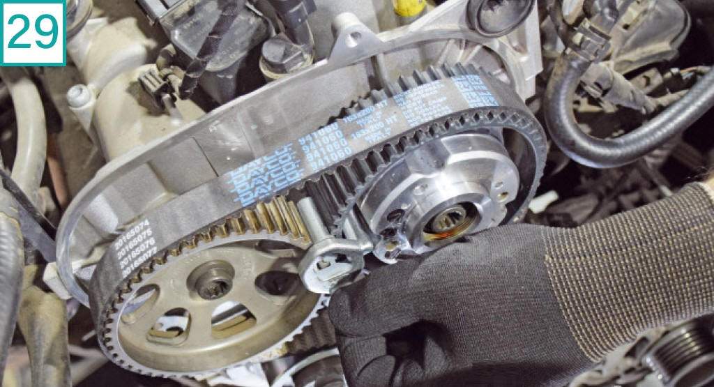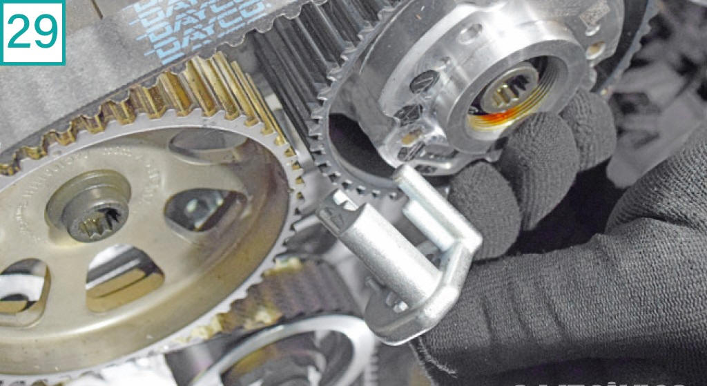 29) Antes de tensionar a correia, remova a ferramenta de ponto das polias.