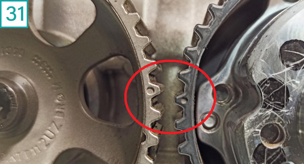 31) Tire as ferramentas de fasagem dos eixos comandos de v�lvula e do virabrequim e d� duas voltas no motor. Depois, verifique o ponto por essas mesmas ferramentas dos comandos e do virabrequim. N�o tome como base os pontos das polias de comando, pois, eles n�o se casar�o mais. |