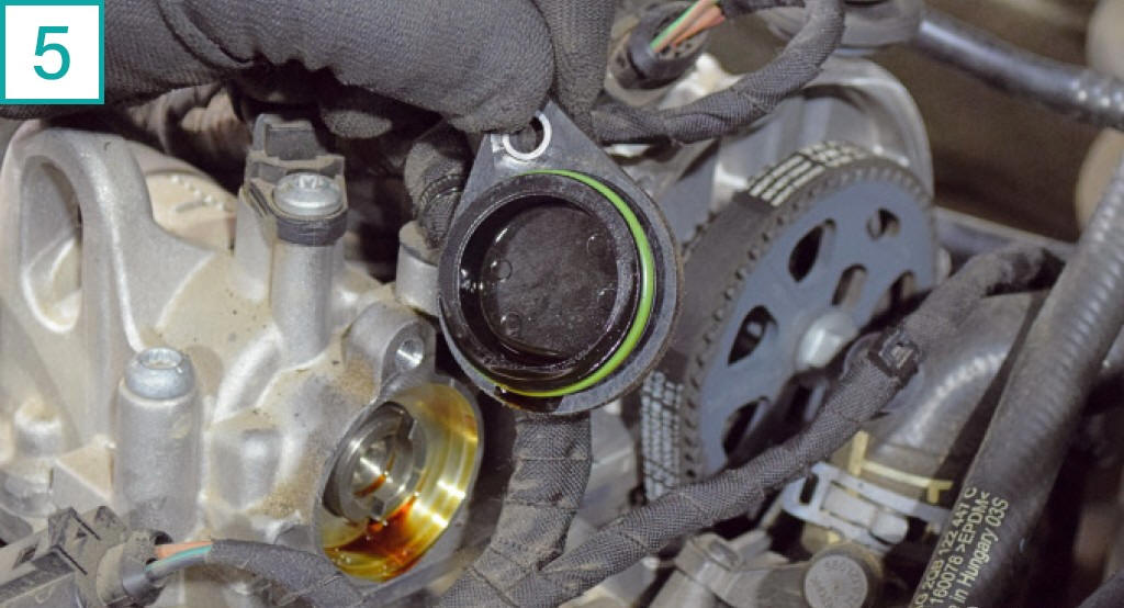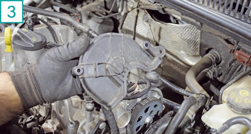 | 5) Ao lado da polia da correia da bomba d��gua, fica a tampa de acesso � fasagem do comando de admiss�o, presa por um parafuso de cabe�a hexalobular T30. Para ajudar a sacar a tampa, use com cuidado uma chave de fenda. A tampa possui veda��o por o�ring, que pode ressecar. Troque o anel a cada remo��o. |