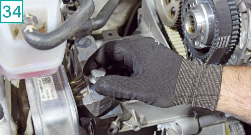 ![]() 32) Fa�a novamente o tensionamento da correia. Desta vez, aplique o torque de aperto definitivo no parafuso de fixa��o do tensor: 25 Nm. |