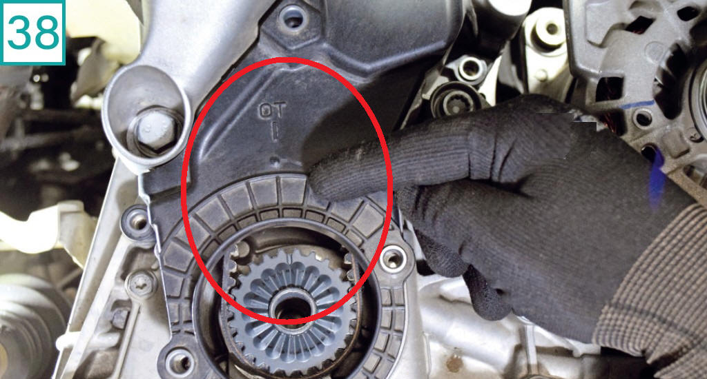 ![]() 38) Reinstale a tampa de prote��o da correia de sincronismo. Observe a marca �OT�, que ser� a refer�ncia de montagem da polia da correia de acess�rios