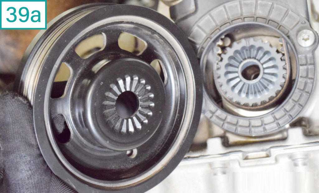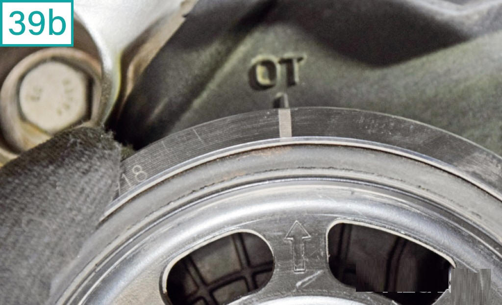 39) A posi��o de montagem da polia de acess�rios segue as estrias (39a), que se encaixam com a polia dentada do virabrequim, e a marca��o �OT�. Perceba que a polia possui um pequeno rasgo e uma seta, que devem coincidir com a marca na tampa (39b). Obs: Se as marca��es n�o baterem, confira novamente o ponto com as ferramentas de fasagem.