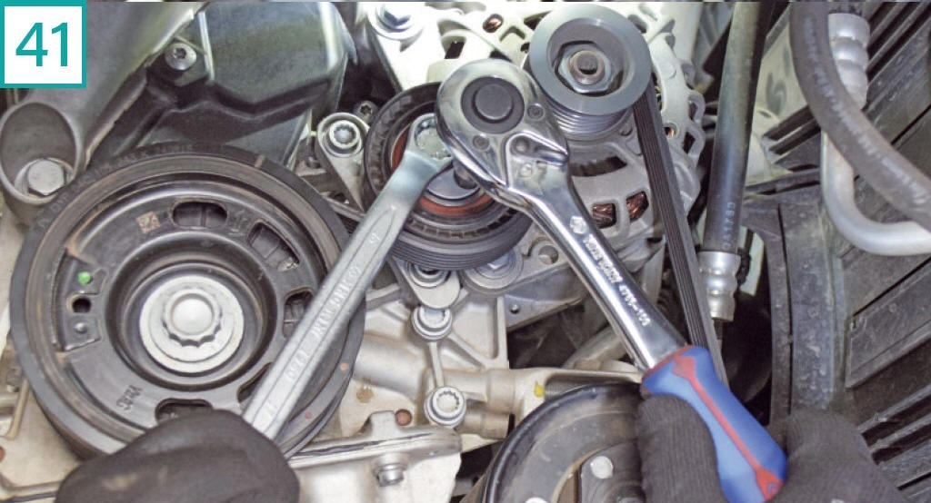41) Instale novamente o tensor da correia de acess�rios e a correia na sequ�ncia. Para encaixar a correia, gire o tensor no sentido anti-hor�rio. Depois, gire o tensor no sentido hor�rio at� o ponto de tens�o e aperte o parafuso de fixa��o. A folga de trabalho da correia n�o pode ultrapassar 1 mm entre os lados.