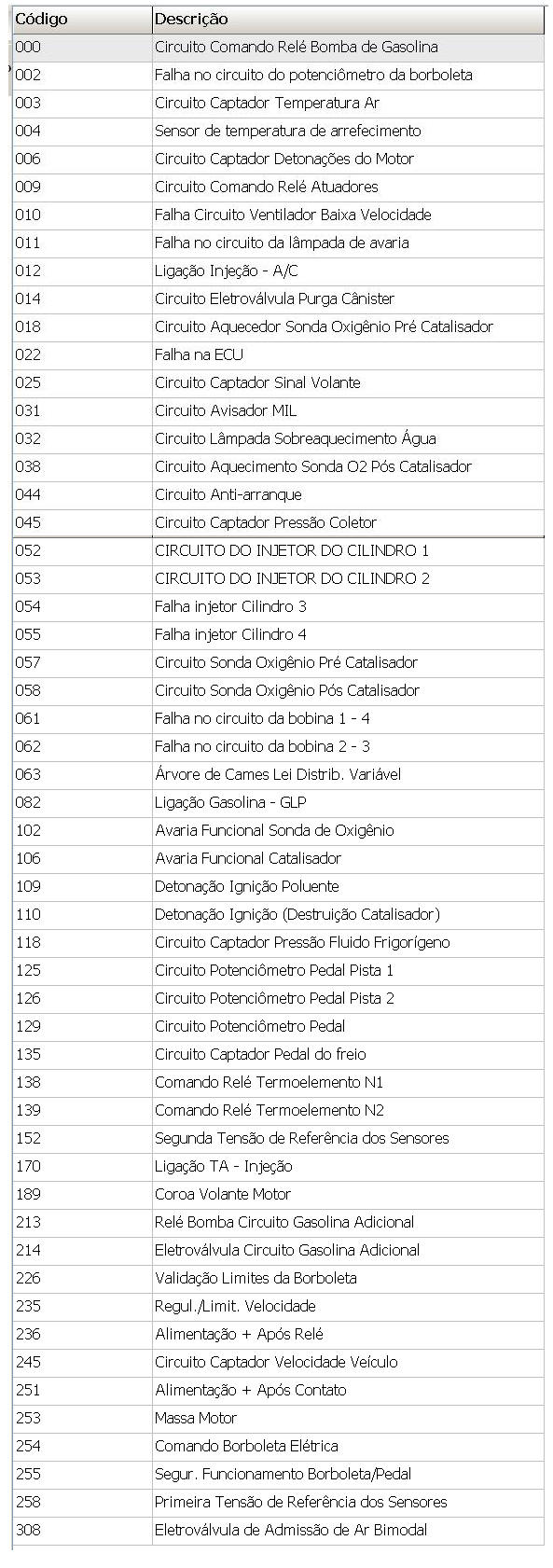 C�DIGOS DE FALHAS