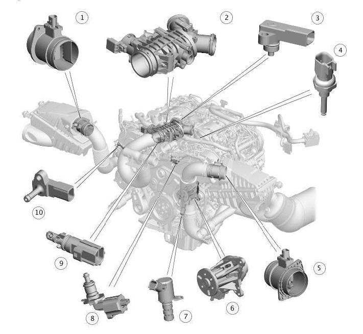 01 - MEDIDOR DA MASSA DE AR 02 - CORPO DE BORBOLETA 03 - SENSOR MAP 04 - SENSOR DA TEMPERATURA DO LIQUIDO - CABE�OTE 05 - MEDIDOR DA MASSA E TEMPERATURA DO AR 06 - BOMBA D��GUA 07 - SOLEN�IDE DE CONTROLE DA BOMBA DE �LEO 08 - SENSOR DA TEMPERATURA DO L�QUIDO DE ARREFECIMENTO - BLOCO 09 - SENSOR DA TEMPERATURA DO AR -TURBO 10 - SENSOR DE PRESS�O DO TURBO